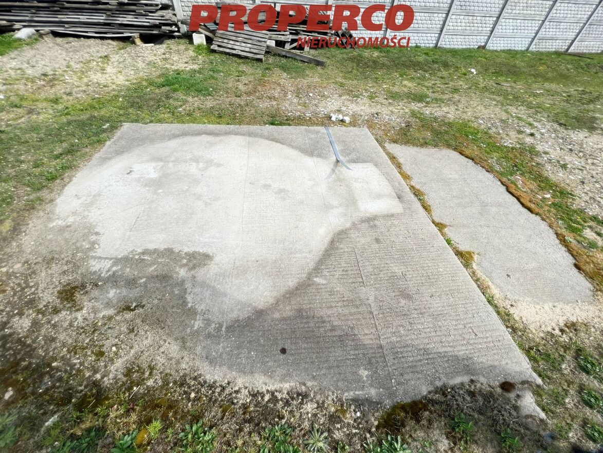 Działka o pow. 1940 m2 częściowo zagospodarowana i w całości ogrodzona, o kształcie zbliżonym do trapezu o wymiarach około: 35 front x 55,5 x 35 x 55,5 . Wjazd na nieruchomość bramą o szer. 7m otwieraną na pilota. Teren działki został specjalnie utwardzony, aby można było wjeżdżać na nią autami typu TIR. Na działce znajduje się też utwardzone miejsce pod zbiornik na paliwo, kontener oraz wiaty.